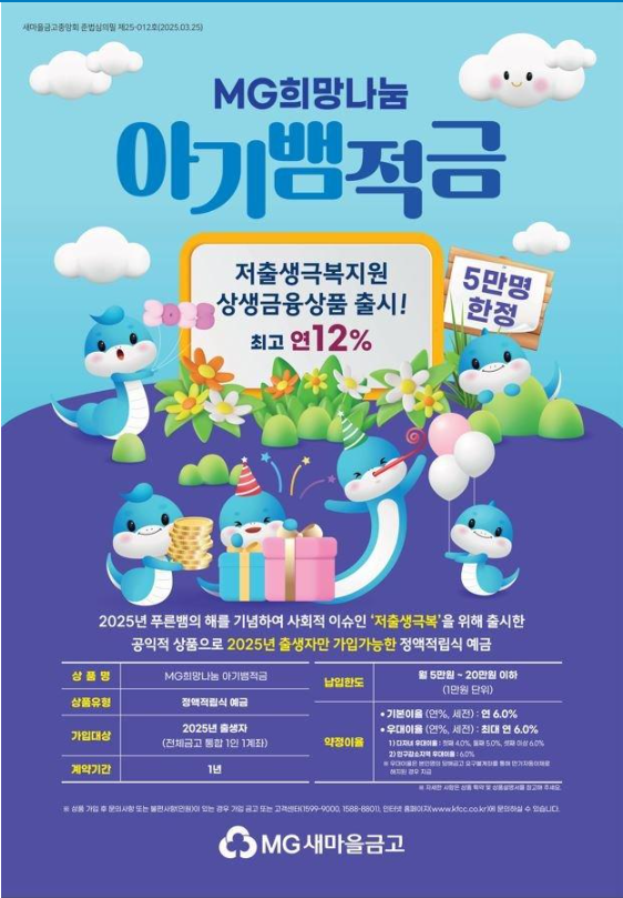 저출생 극복과 출산 장려를 위해 MG새마을금고에서 출시한 공익성 금융상품입니다. 2025년 출생자 전용으로, 출생 이후 새마을금고 창구에서만 가입할 수 있습니다.